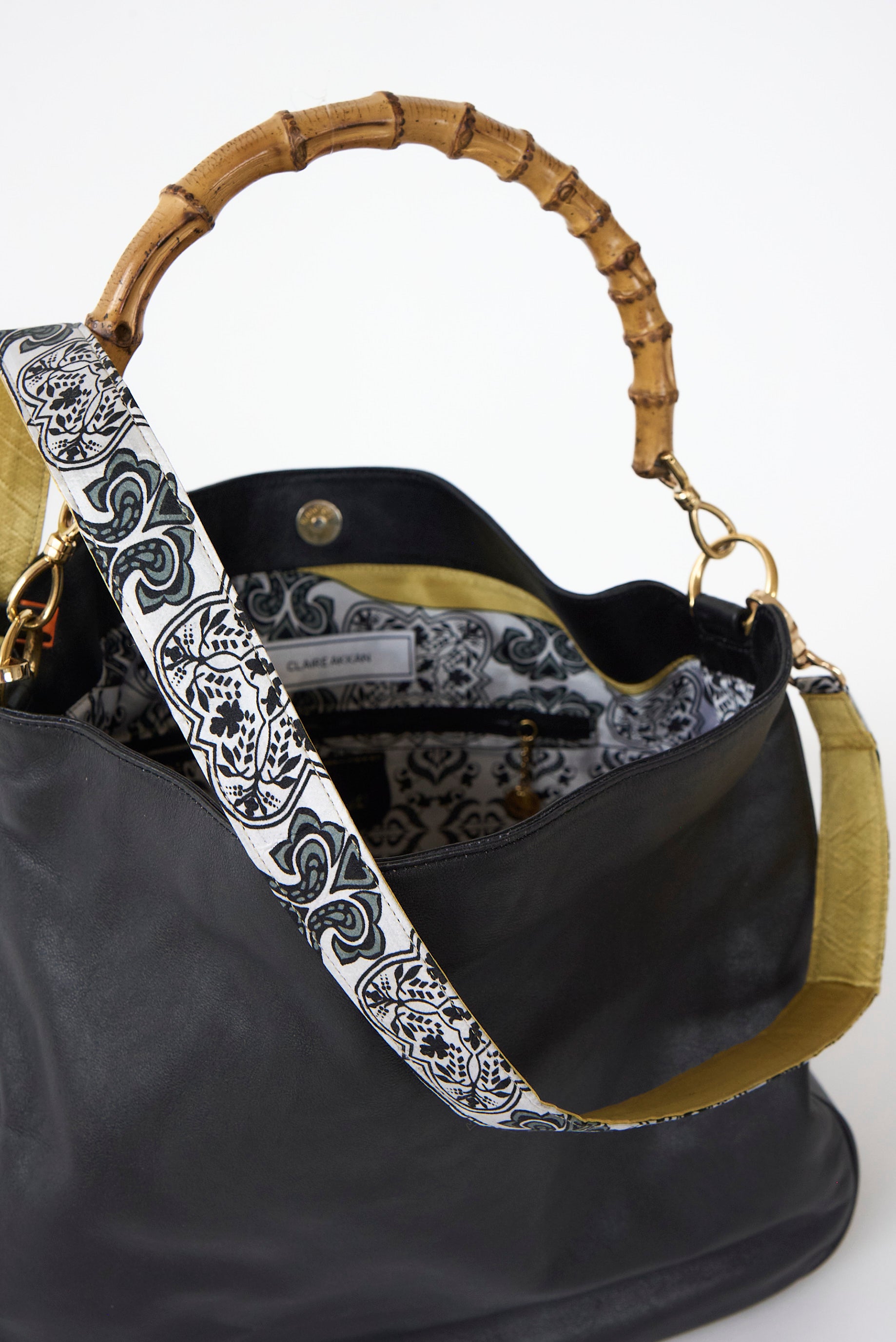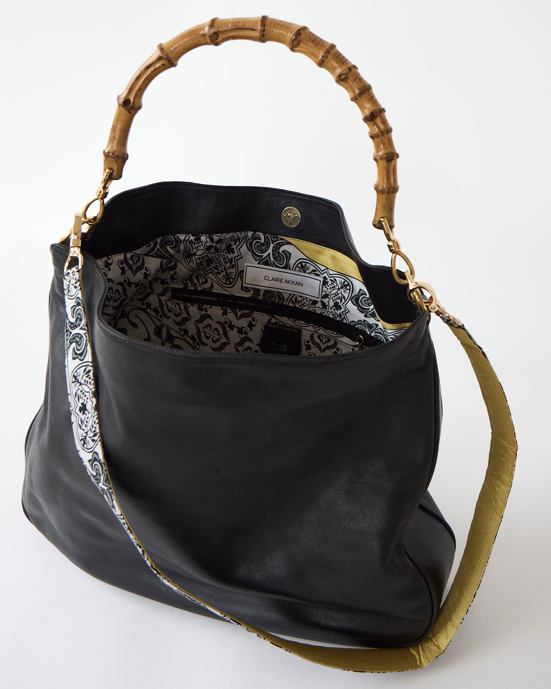 The Next Gen It-Girl bag. Upcycled from a vintage Gucci bag with a genuine bamboo handle and retrofitted with a vintage silk scarf. Enjoy a removable strap that matches the inside lining. Neutral on the outside, with a secret just for you on the inside. This one-of-a kind piece is perfect as your everyday bag or for special occasions, fitting a book and all your essentials with an interior pocket.