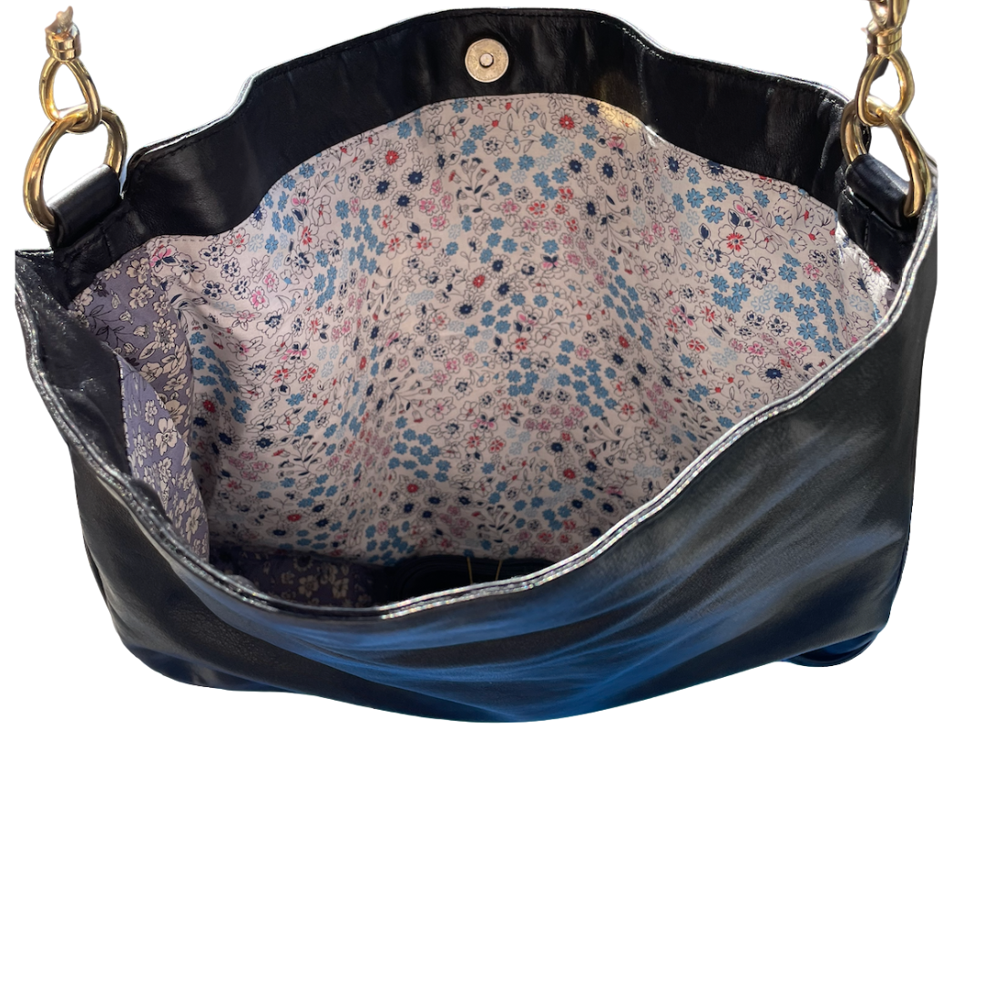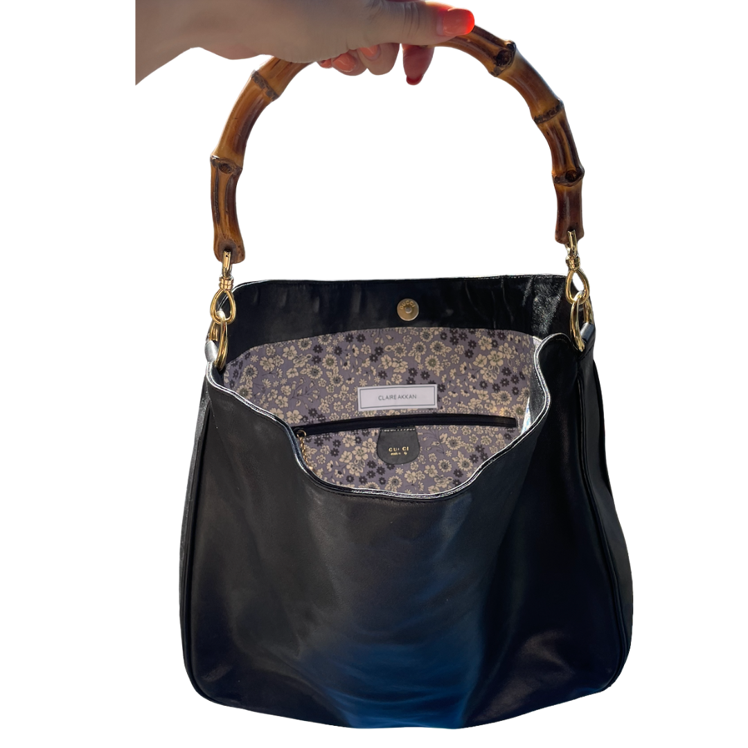 Vintage black leather Gucci bag lined with two floral fabrics. Original bamboo handle.