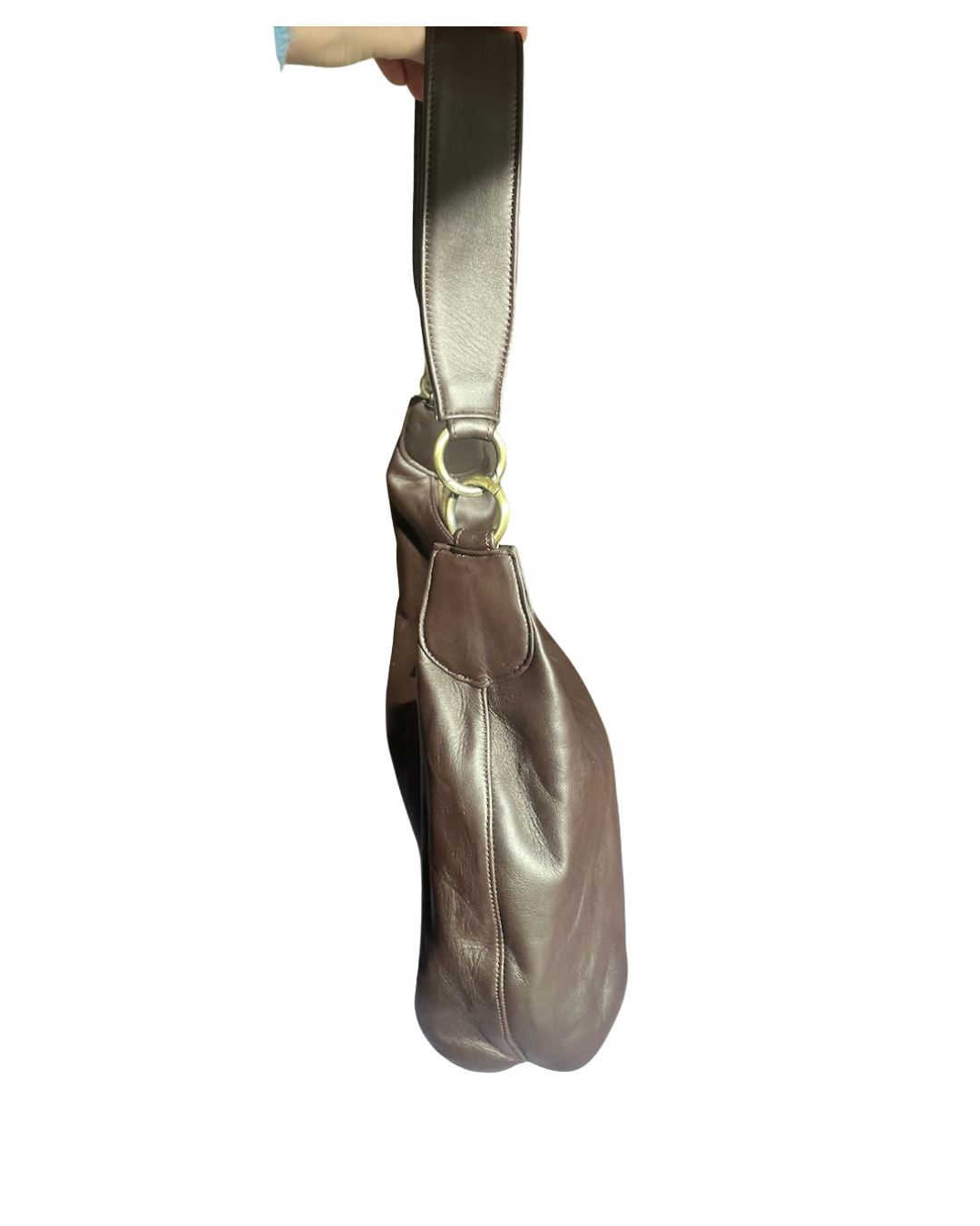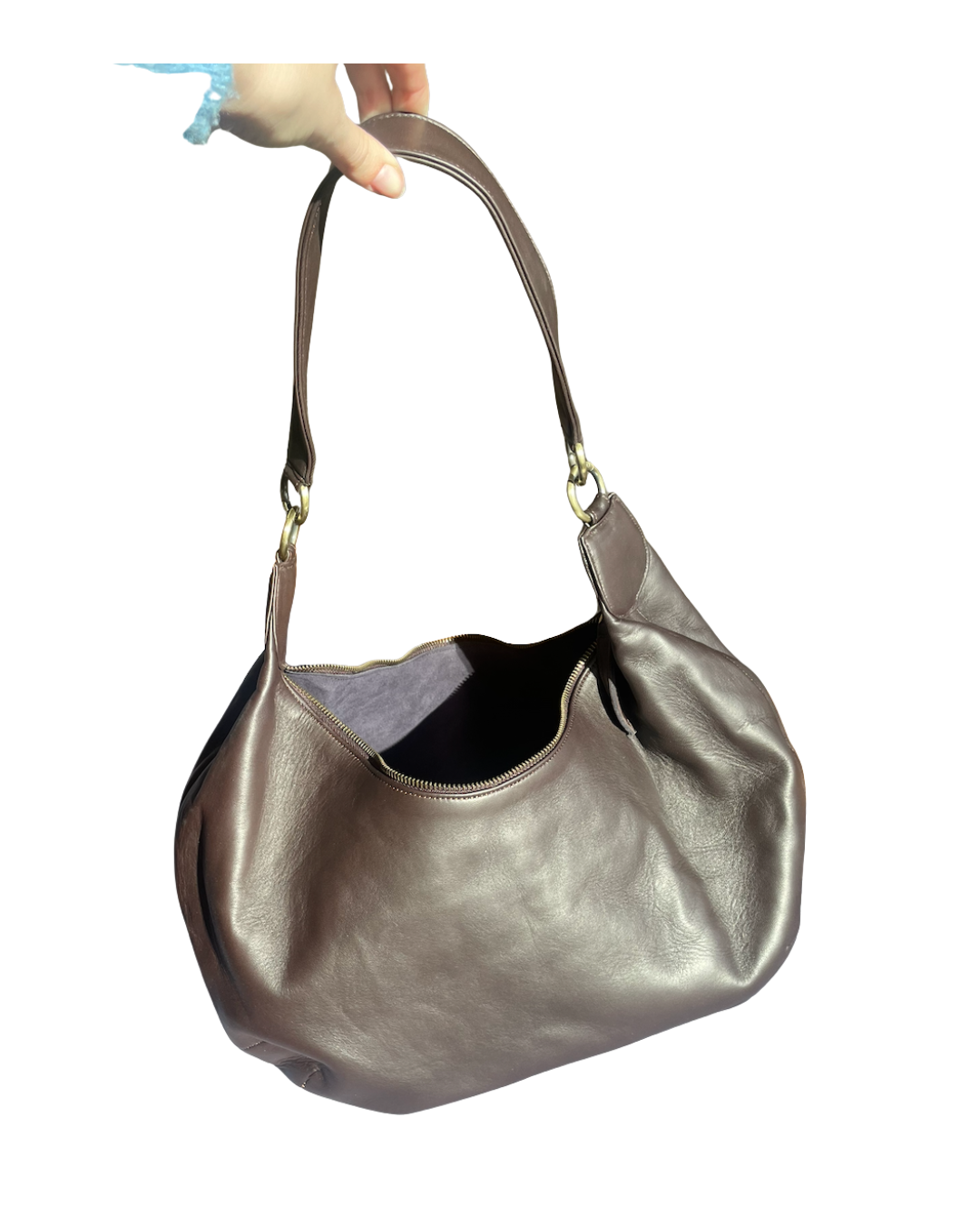 This structured leather handbag balances form and function with ease. Made from smooth brown leather and designed to sit comfortably on the shoulder or in hand, it offers generous interior space while maintaining a clean, architectural shape.