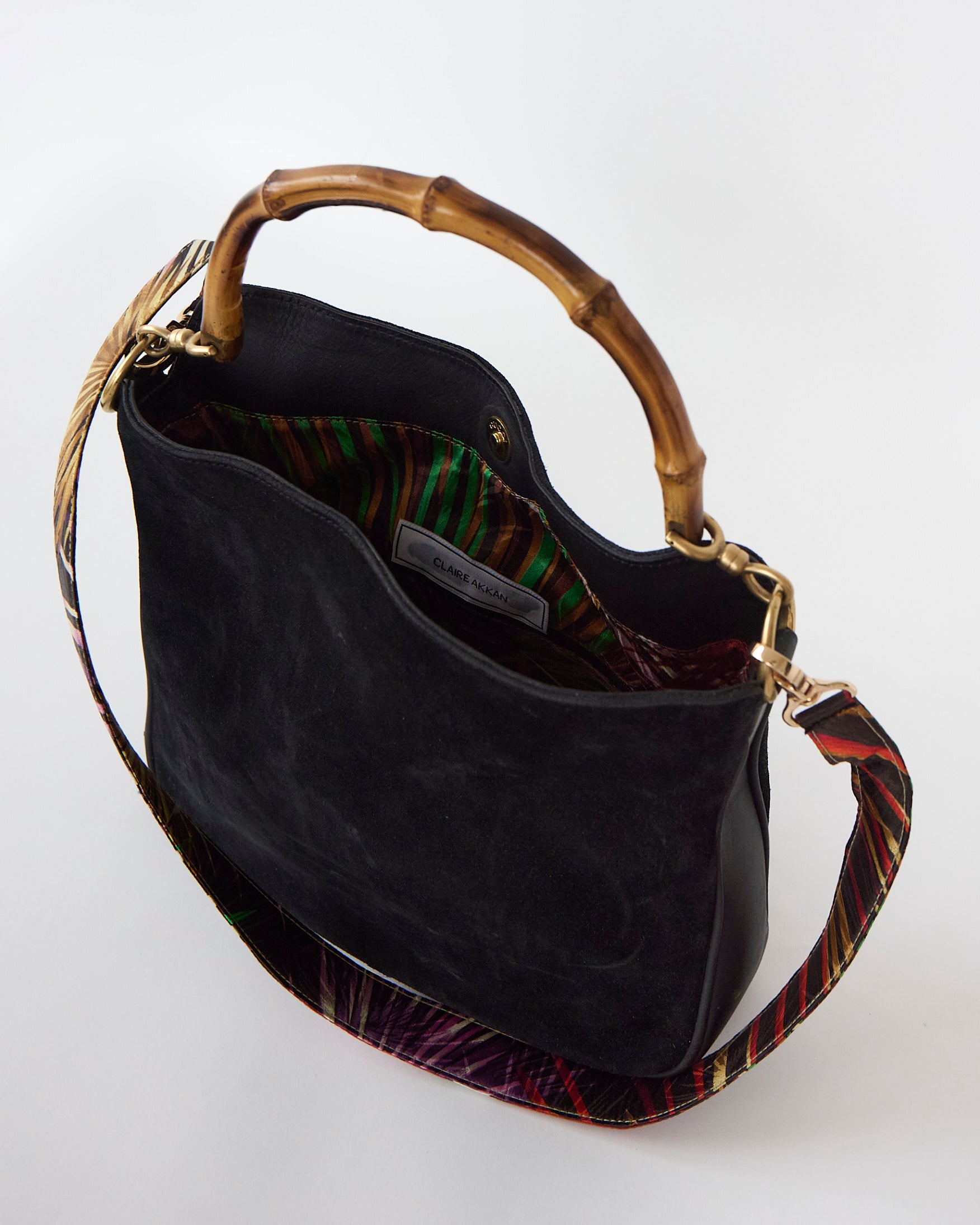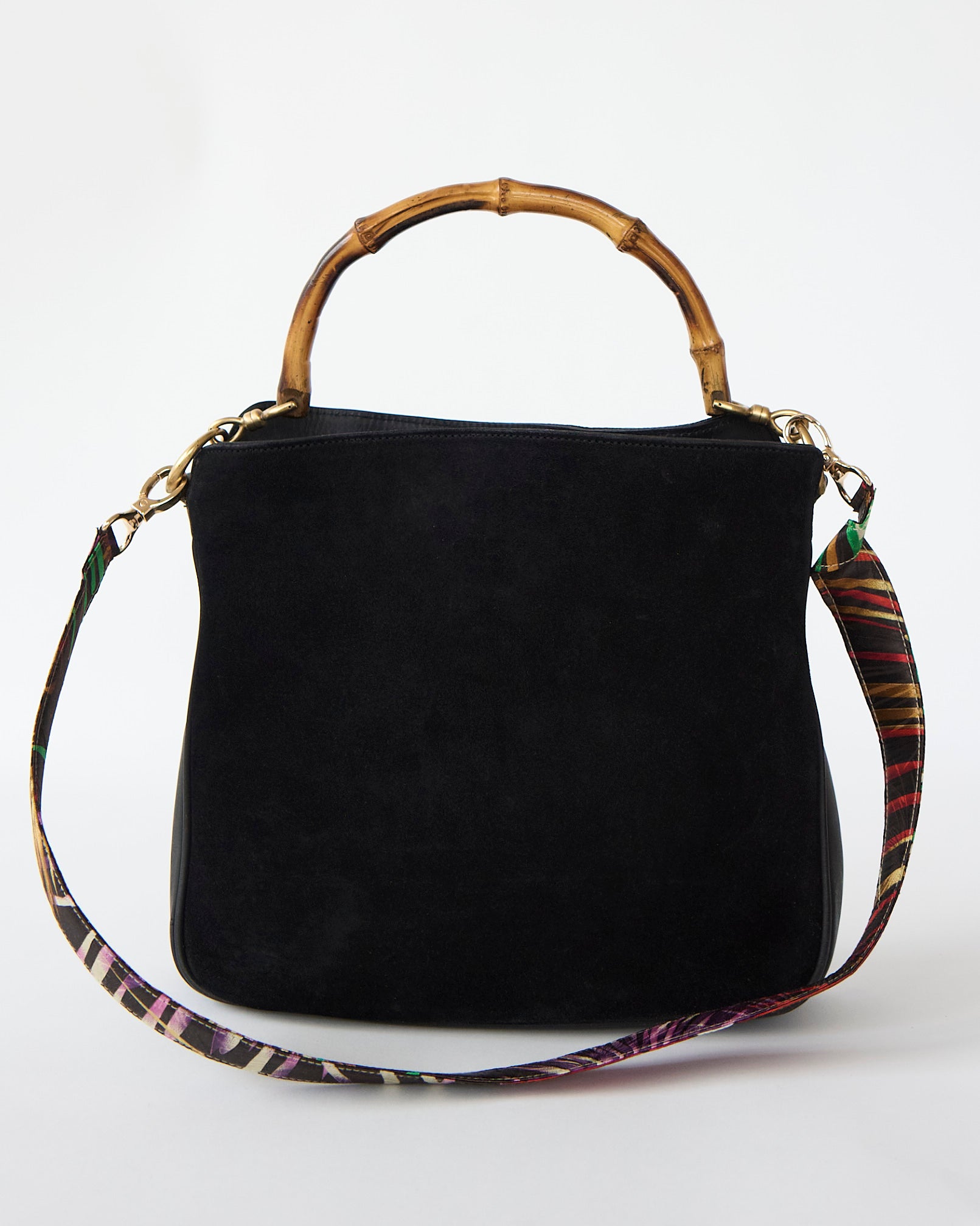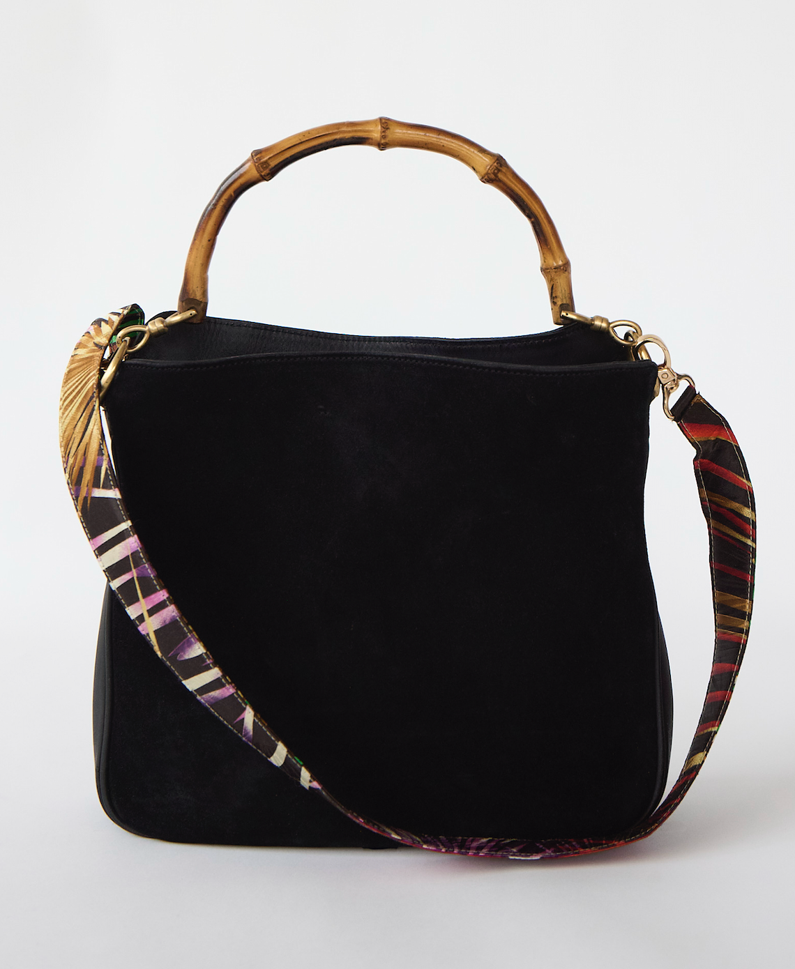 The Next Gen It-Girl bag. Upcycled from a vintage black suede Gucci bag with a genuine bamboo handle and retrofitted with a vintage silk scarf. Enjoy a removable strap that matches the inside lining. Neutral on the outside, with a secret just for you on the inside. This one-of-a kind piece is perfect as your everyday bag or for special occasions, fitting a book and all your essentials with an interior pocket.